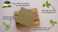 INGREDIENTS :- Saponified coconut oil, Sesame oil, Olive oil, Castor oil, Purified aqua, Neem oil, Neem extract, Green tea extract, French green clay, Vitamin E, Tea tree essential oil, Tulsi essential oil.